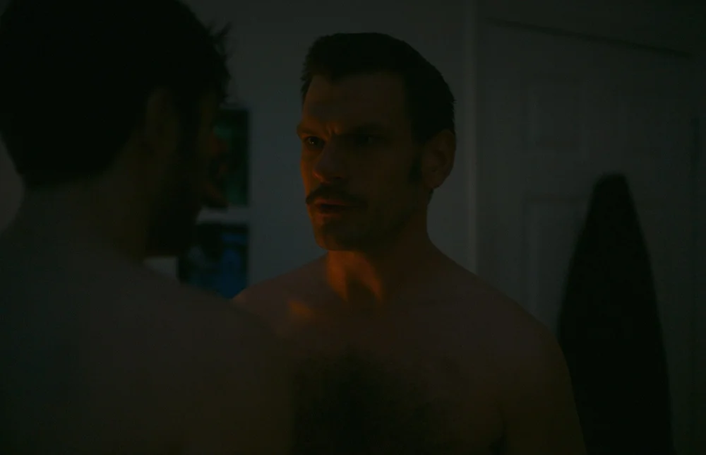 É exatamente nesse ambiente que John Cameron Mitchell se torna o eixo gravitacional do filme. Sua atuação é visceral desde o primeiro movimento. A forma como ele usa o corpo, como interage com Morgan cria uma presença que domina a cena sem exagero. Mitchell entrega uma performance que mistura fragilidade contida e autoridade desconfortável, fazendo do homem mais velho uma figura impossível de prever. Seu olhar, muitas vezes fixo e quase indecifrável, mantém a narrativa em estado de alerta constante. Ele conduz o curta para territórios que seriam inócuos sem a profundidade que imprimiu ao personagem.